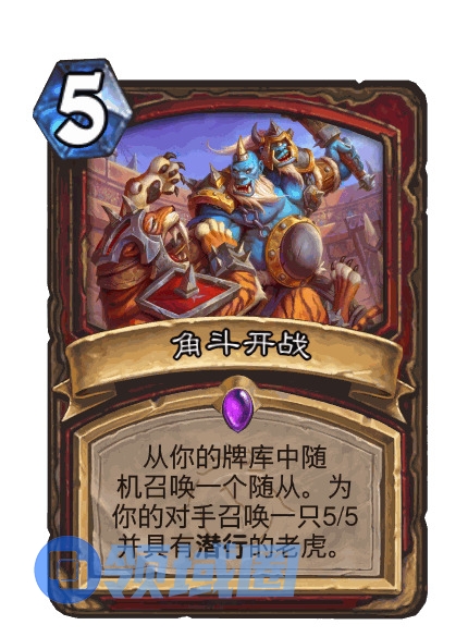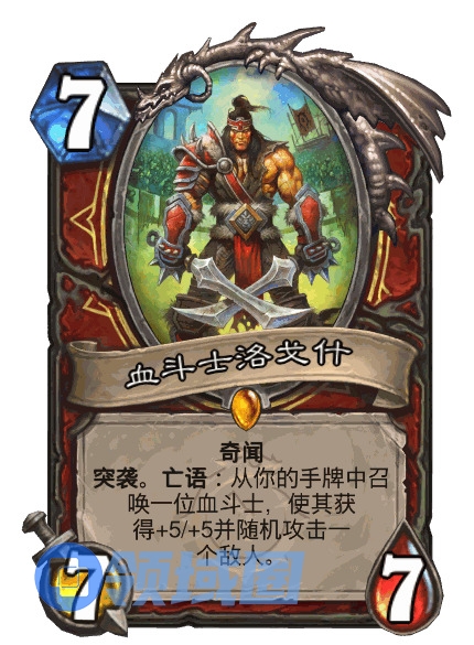 奇闻。突袭。亡语:从你的手牌中召唤一位血斗士,使其获得+5/+5并随机攻击一个敌人。