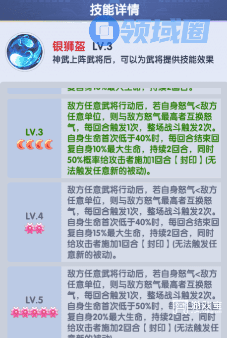 其次就是另一个非常BUG非常强力的封印效果,穿戴银狮盔的武将被打到半血以下时会对攻击者触发1~2回合的封印,被封印者的天赋、芯片、神武、哨兵、时装都会失效(大部分没写明免疫封印的效果都会失效,包括银狮盔本身),一个武将失去了天赋芯片神武时基本就只是个废物了。
