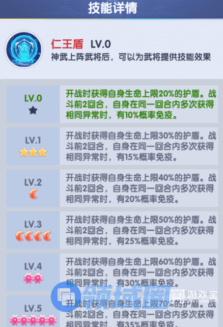 仁王盾的重要程度和升星优先级最低,先激活拿个图鉴属性就行。满星的护盾量就相当于彩色芯片【磐石之盾】而已,额外那个免疫异常的效果在前期可能也就是比较克制吴国燃烧流而已,后期武将技能出手次数多了这个免疫异常才稍微比较有用。