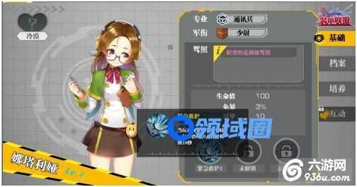 娜塔莉娅妹子的军衔是少尉,专业是通讯兵,初始人物属性是为您的坦克增加100点生命值、免暴增加3%、装甲增加10点。初始技能为紧急救护I,效果为当玩家坦克生命值低于50%时,每秒治疗10点伤害,持续10秒。