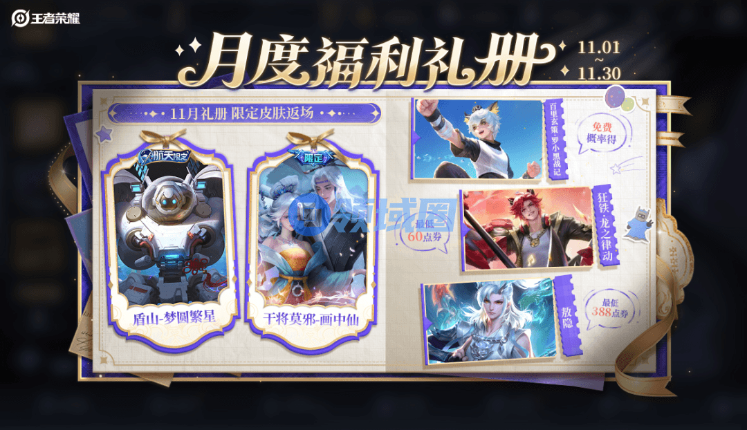 11月礼册即将开启,免费奖池领奖次数刷新,折扣奖池返场干将莫邪-画中仙、盾山-梦圆繁星。