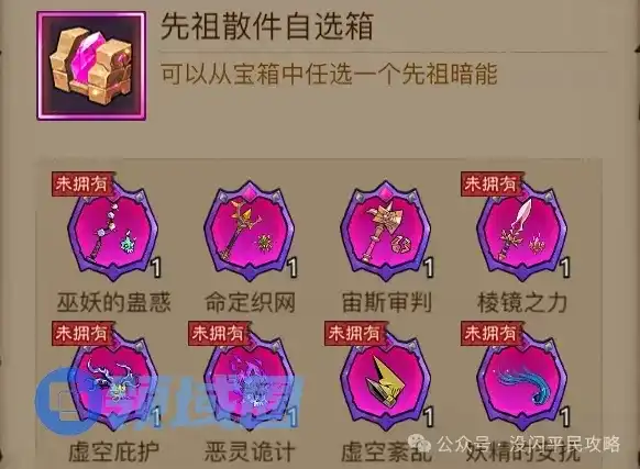 先祖散件自选箱:目前自选箱总计有53件装备!自选箱获取的主要渠道就是绝境深渊-无尽挑战(每周至少白嫖1个、打到50层、80层、110层还可再额外白嫖1个)
