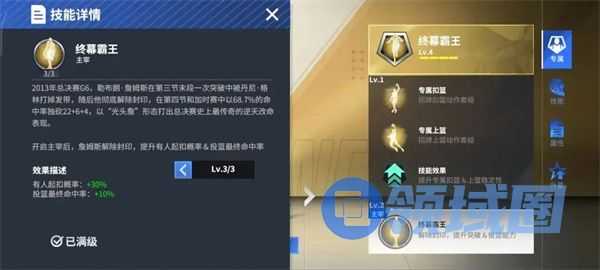 3级专属:解锁专属盖帽动作,同时增加空位命中率,且分差落后五分以上时增加最终命中率。