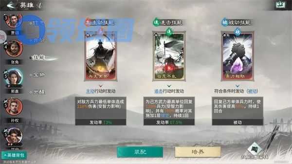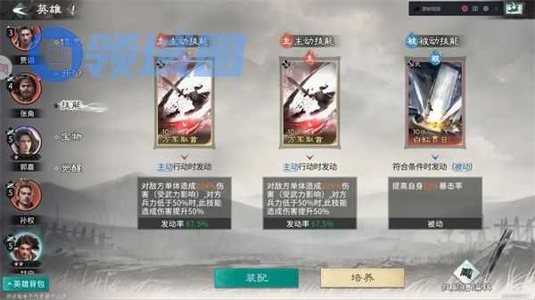 主动技能:推荐携带万军取首,技能本身倍率不低,对上敌方残血兵力还能提高技能伤害,有着不错的收割效果。