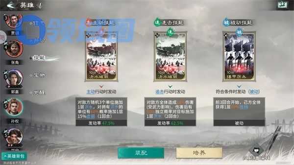 主动技能:推荐携带决水破敌,可以给敌方随机三名单位套上【洪水】效果,受到持续伤害的同时,使敌方速度降低,联动甘宁自带天赋【锦帆袭掠】,可以提升大量暴击率和暴击伤害,且有概率给敌方套上一层【虚弱】效果,降低敌方伤害。
