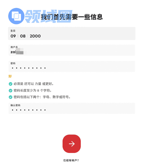 3. 完成验证码,密码设置,生日设置,确认服务条款即可完成注册。