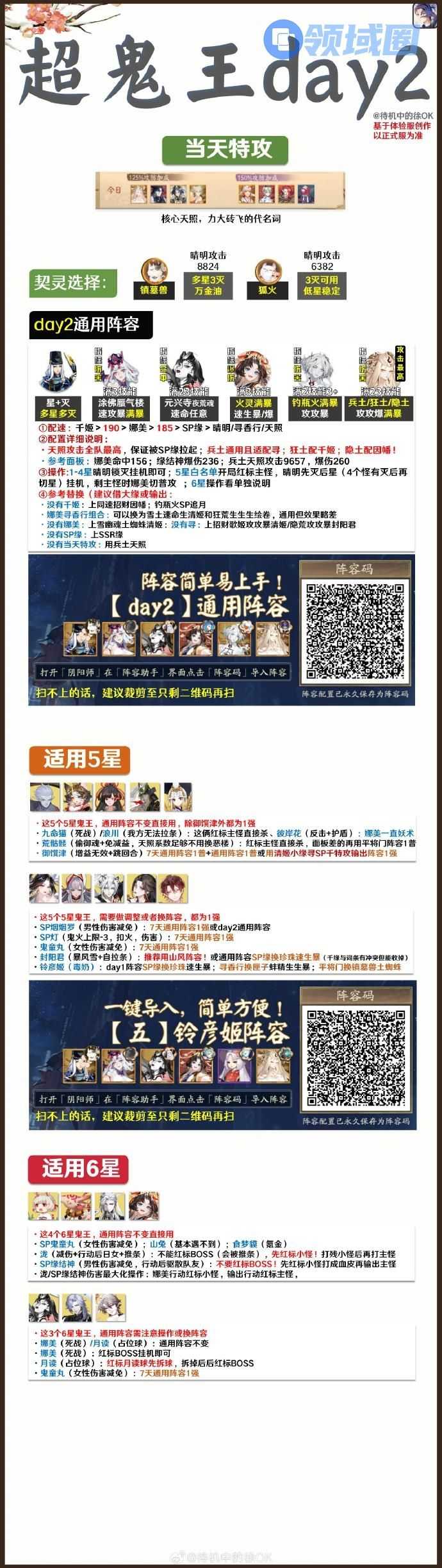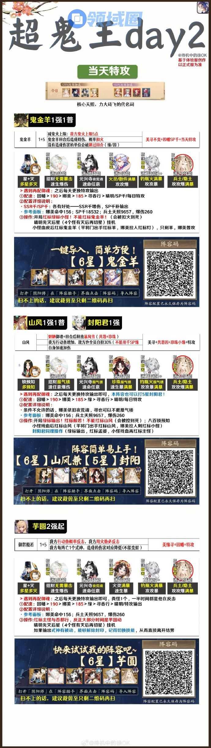 阴阳师超鬼王DAY2阵容推荐已经分享在上面,感兴趣的小伙伴可以参考本篇攻略,希望能为各位玩家们带来帮助,想要了解更多游戏攻略及资讯请持续关注领域圈游戏。