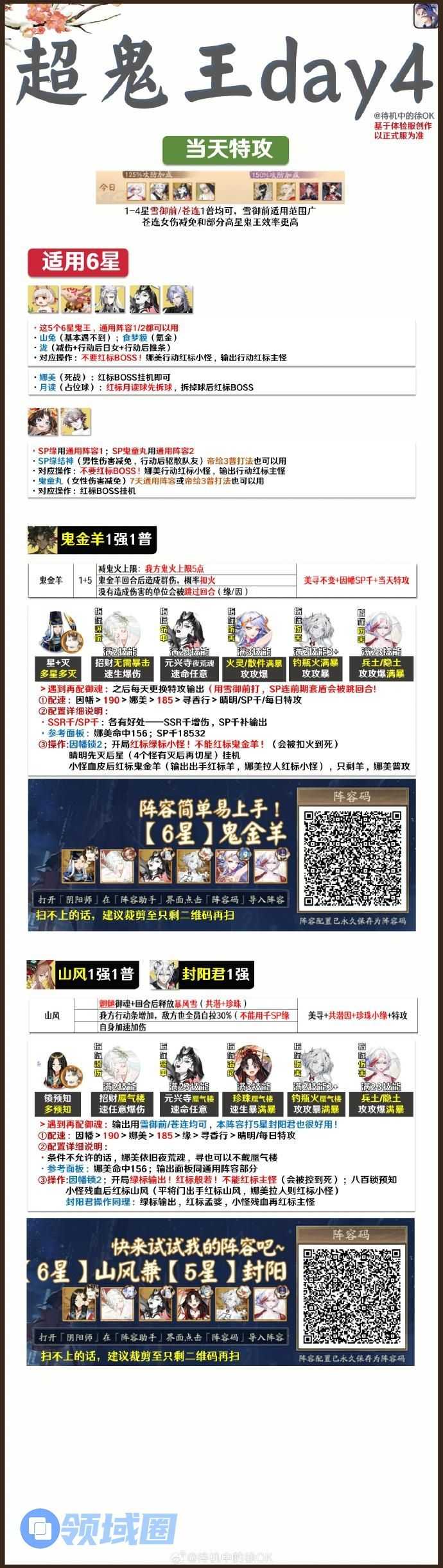 阴阳师超鬼王DAY4阵容推荐已经分享在上面,感兴趣的小伙伴可以参考本篇攻略,希望能为各位玩家们带来帮助,想要了解更多游戏攻略及资讯请持续关注领域圈游戏。