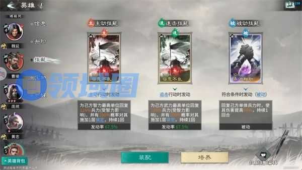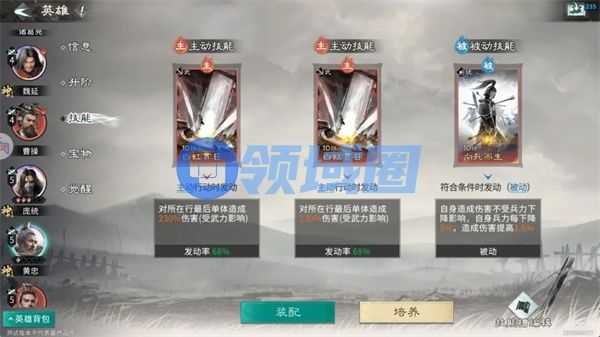 主动技能:推荐携带临危不乱,可以为队伍中智力最高的庞统提供回复效果,且还能提供【镇定】效果,让庞统免疫控制
