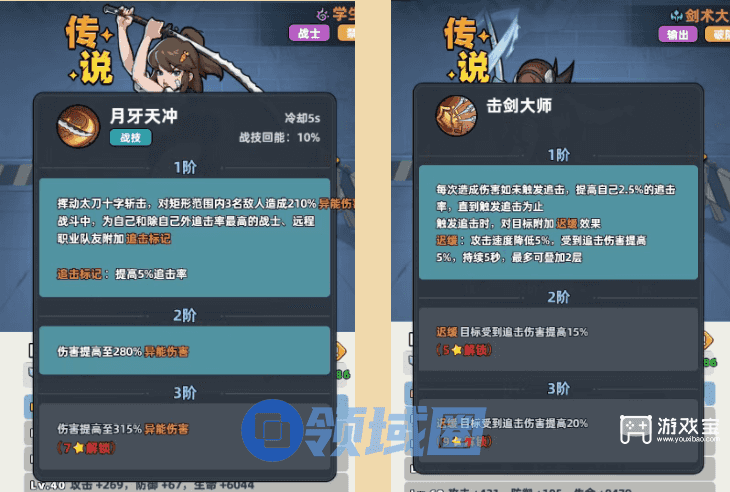 举例:学生妹的技能月牙天冲,可以给自己和队友附加追击标记,增加追击率,打出连环输出;而击剑大师在触发追击时,将给敌人挂上“迟缓”效果,降低敌人的输出,提高追击的伤害。