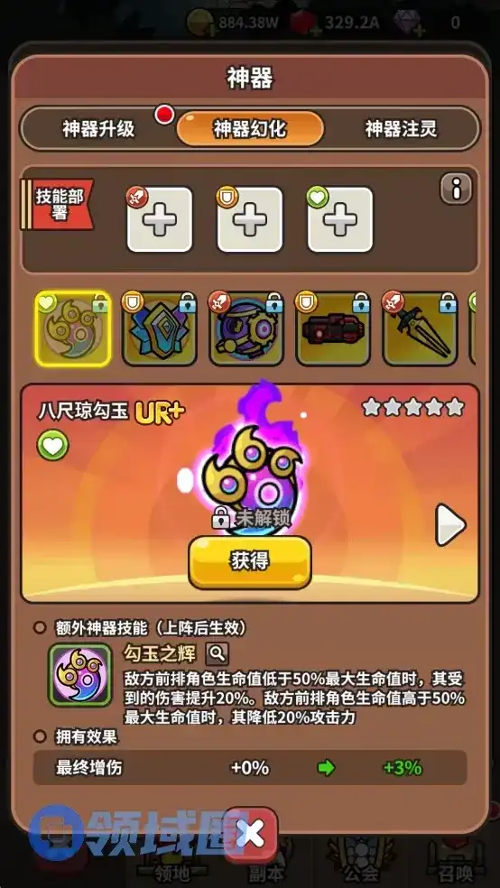 神器幻化与坐骑幻化一模一样。同样可以上阵已经解锁的神器技能,同样分为攻击型、防御型、辅助型三个类型,每样类型可只能上阵一个技能。