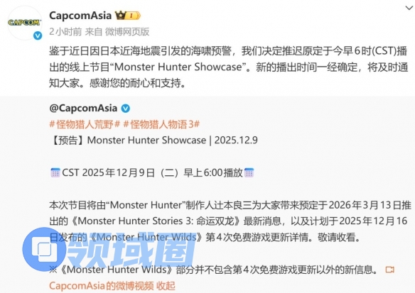 Capcom原定于北京时间今日早6点举行的《怪物猎人》特别直播活动,将由系列核心制作人辻本良三(被粉丝亲切称为“三太子”)亲自主持。直播计划带来两大重点内容:一是正式揭晓《怪物猎人物语3:命运双龙》的最新情报;二是详细介绍《怪物猎人:荒野》即将发布的第4次大型免费游戏更新详情。然而,CapcomAsia官方微博于今早发布公告,受近期日本近海地震及引发的海啸预警影响,原定于今早6时(CST)播出的线上节目“Monster Hunter Showcase”确认延期。