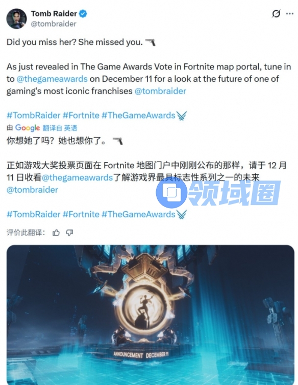 《古墓丽影》官方推特于近日正式确认,系列全新作品将在12月12日北京时间上午8:30开启的TGA 2025颁奖礼上正式公布。官方以一句充满情怀的“你想她了吗?她也想你了。”作为开场,并指引粉丝通过《堡垒之夜》内的互动地图门户所揭示的信息,在12月11日(美国时间)锁定TGA直播,以了解这个“游戏界最具标志性系列之一的未来”。