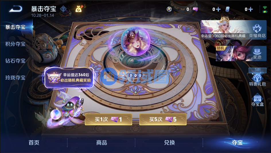 玩家参与暴击夺宝,每次都有机会额外获得更多的幸运值,暴击夺宝幸运值达360之后,下一抽必得随机典藏奖励。