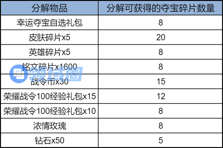 7、分解规则:在夺宝盒中,选中要分解的奖励,点击分解即可把对应奖励分解成夺宝碎片。分解规则如下:
