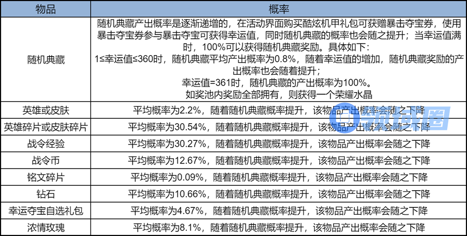 4、暴击夺宝奖励:每次暴击夺宝,有机会获得: 随机典藏奖励(具体物品详见下方随机典藏奖励说明)、皮肤、皮肤碎片、英雄碎片等奖励。