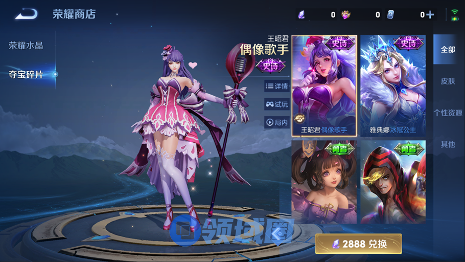 5、夺宝碎片使用:在荣耀商店 - 夺宝碎片兑换页,可使用 “夺宝碎片” 兑换:典藏皮肤个性资源。