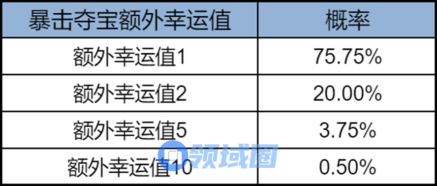 暴击夺宝有40%的概率额外获得幸运值,在触发暴击的情况下,获取额外幸运值的概率如下: