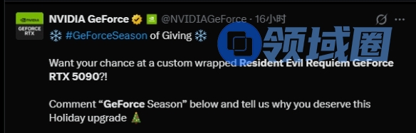近日,英伟达在社交媒体上发布了一款以《生化危机9:安魂曲》为主题的定制GeForce RTX 5090公版显卡,并将通过抽奖方式赠送。这一抽奖活动将在英伟达的Facebook、Ins和推特官方账号上进行。