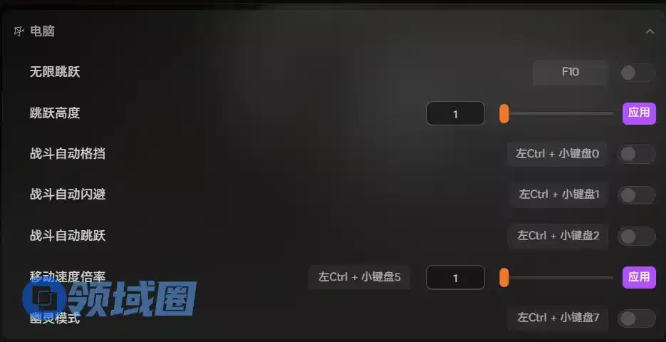 战斗方面比较好用的功能:无限跳跃、跳跃高度、战斗自动格挡闪避以及跳跃、移动速度倍率、幽灵模式等
