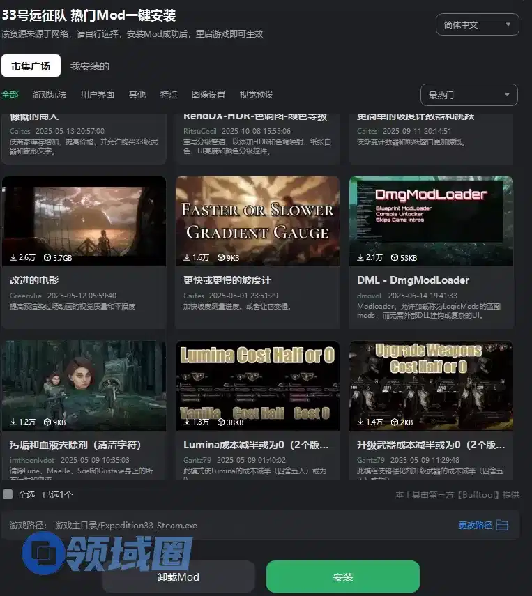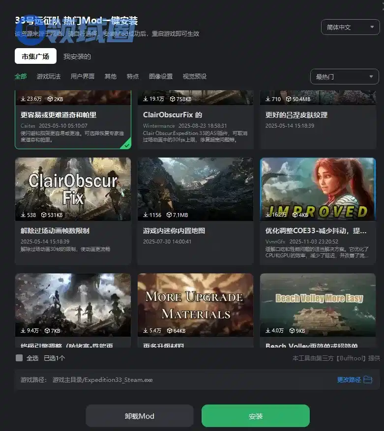 工具还自带互动地图防止迷路和方便探索,且收纳了很多mod,点开mod广场就可以看到很多皮肤mod\画面优化mod\以及内置地图和很多玩法相关的mod内容,这个大家可以进去后选择自己想要的mod后直接一键安装~不想要的时候也可以选中后一键卸载,非常的方便管理且易操作!