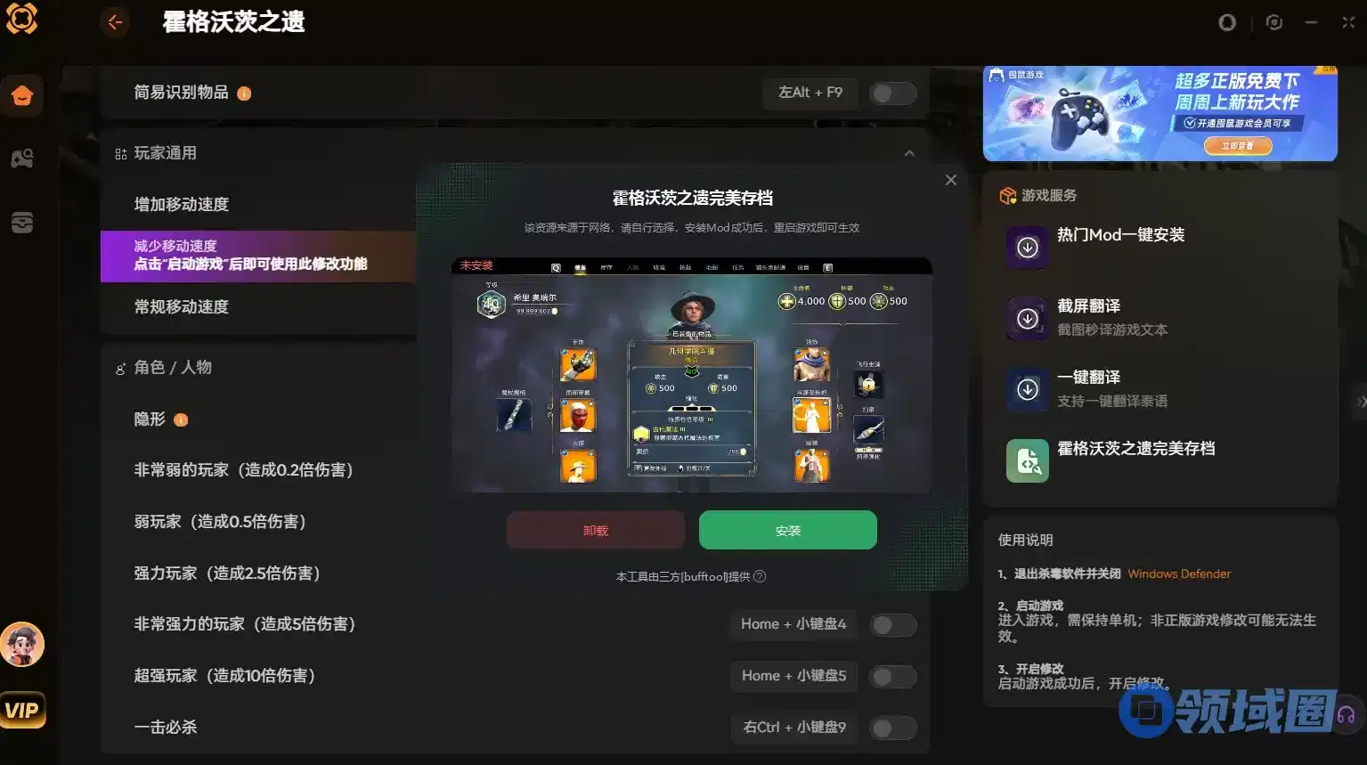 当然如果你想要完美存档,这里也一起分享给大家,点击右侧游戏服务里的【完美存档】,即可进入一键安装界面,点击安装就能直接打入游戏生效~非常适合新手以及小白玩家,无需额外重复操作,不需要存档的时候这个位置打开点击卸载就可以干净卸载~
