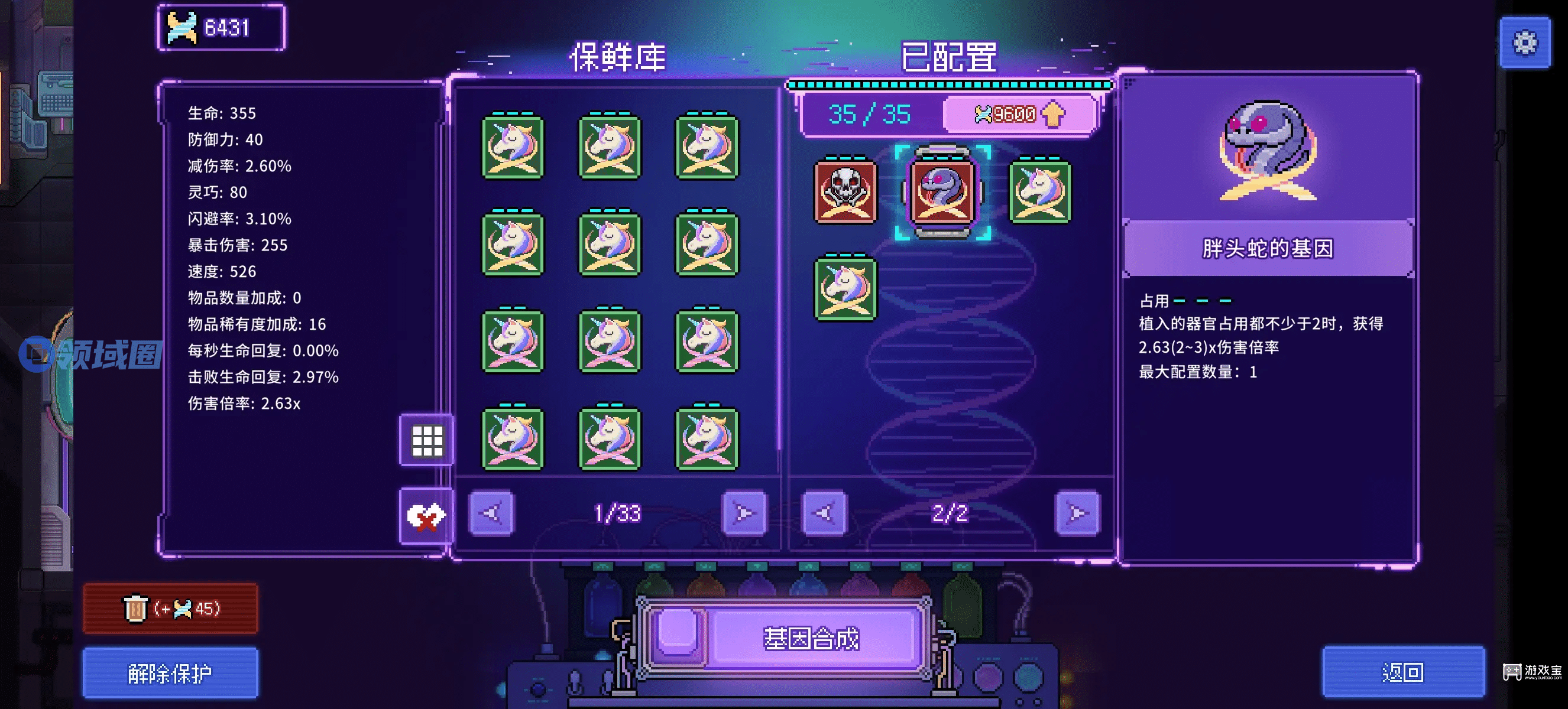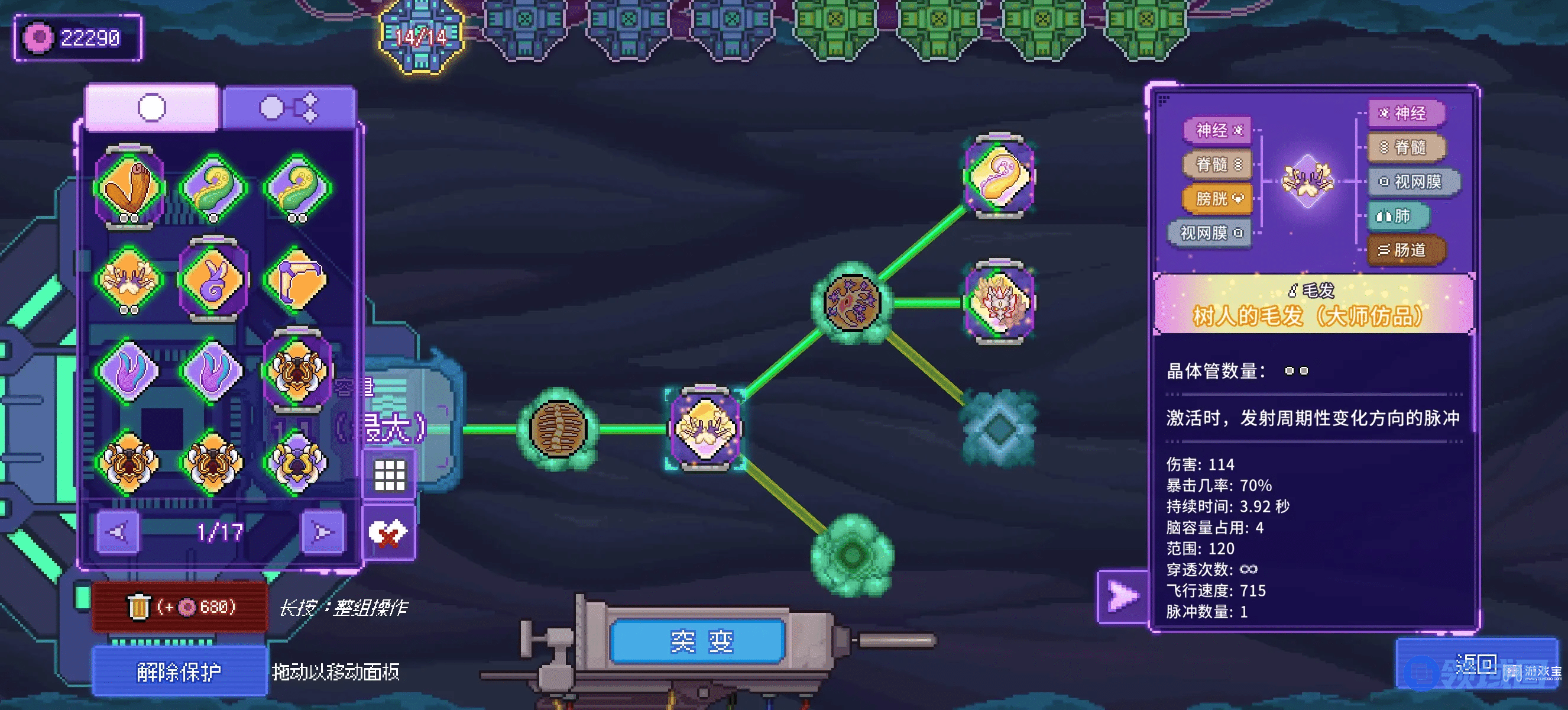 5、个人建议带八爪鱼基因(复制所有大脑),然后一个大脑放幽灵的腹之类的加伤的辅助基因,那个黑色的百分比伤害也带着,打boss有用。其他大脑可以都带一套我说的弹幕流。