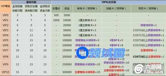 《实况俱乐部》VIP系统分11个等级,创建球队后默认是VIP0级,后续会根据充值情况提升对应的VIP等级,不同的VIP等级有着不同的特权和礼包奖励。具体情况星星以表格的形式为大家列举出来了,希望能够帮助到大家。