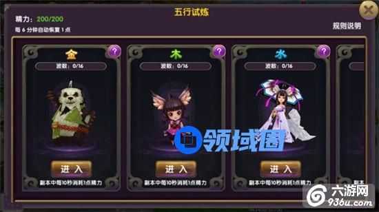 2、参与五行试炼需消耗精力值,副本中每10秒消耗1点,精力值每6分钟自然回复1点,上限200点