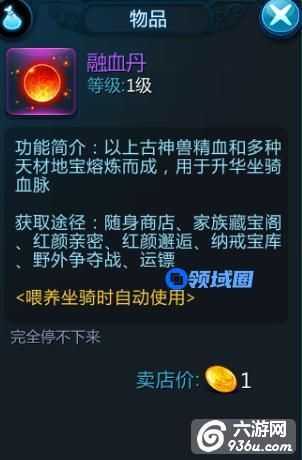 坐骑-融血丹:随身商店、家族藏宝阁、红颜邂逅、运镖、野外争夺战、红颜亲密、纳戒宝库