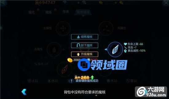 每件装备可以镶嵌6枚魔核,分别是风属性,火属性,水属性,木属性,土属性,雷属性。可以提升大量的战斗力。