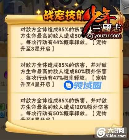 宠物的资源主要在百战沙场玩法产出,资源可以在宠物商店消费,技能的触发几率可以通过升星来提高,平时注意多收集同名战宠碎片。