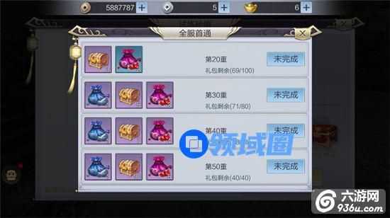 除了每重的通关奖励外,每天登录游戏还能领取一定的奖励,奖励将随着通关重数的增长而增长;从第20重开始,每通关10重就会获得一个相应的全服首通奖励。