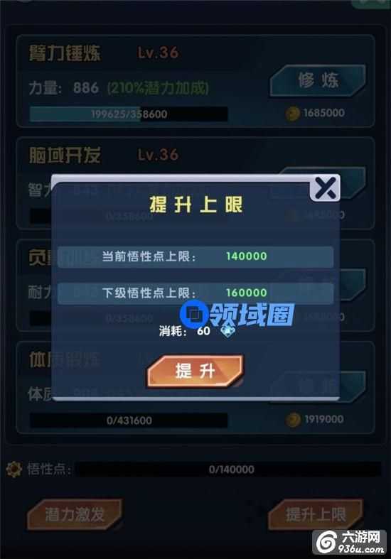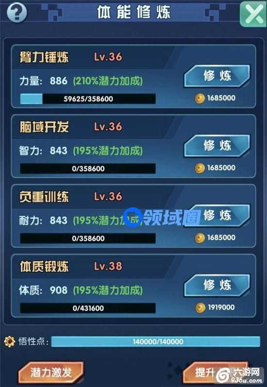 首先体能修炼分为潜力激发和体能修炼两个部分,体能修炼就是选择界面中四个能力中的一个,把悟性点分配给它,当然修炼也需要金币,悟性点是挂机时慢慢累积的,无法人为积累,但小伙伴可以选择提升上限,上限越高,挂机时候囤积的悟性点就越多哦~
