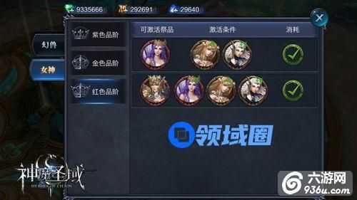在祭坛除了可以用兽魂兑换幻兽碎片以外,还可以兑换女神碎片。与幻兽一样,要想在祭坛中刷出女神碎片就必须签订契约,只要满足激活条件,并且用兽魂激活,就可以在祭坛中刷出对应女神的碎片了。未激活的祭品无法在祭坛中刷出,获得激活条件中描述的女神,即可点亮对应激活条件。同时,女神也有紫色、金色、红色那个品阶,品阶越高的女神,需要的激活条件约苛刻,但是相对应的可以附加的属性值也就越高。