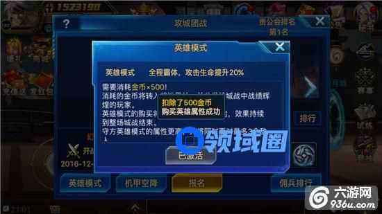 英雄模式:团体攻城中,对自己技术有信心的玩家,不要忘了花费500金币买下英雄模式。买下英雄模式后,守方英雄模式的属性更高,效果持续到整场城战结束,并将同时面对最多3个敌人。攻方英雄则匹配,与守方(英雄)进行3V1的较量或者与守方(非英雄)进行3V3的竞技。(没抢到英雄模式,没关系,还可以花费600金币买下机甲空降变身机甲参与战斗。可在当日10场战斗中操控机甲战斗。)
