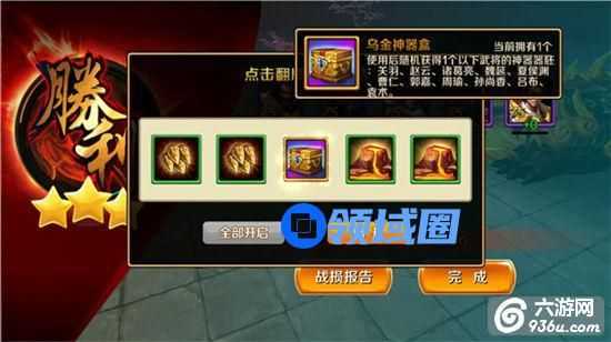 5张牌中,必然有一张为神器宝箱,开启可获得随机神器!能否一次抽中,就要看主公的人品啦~