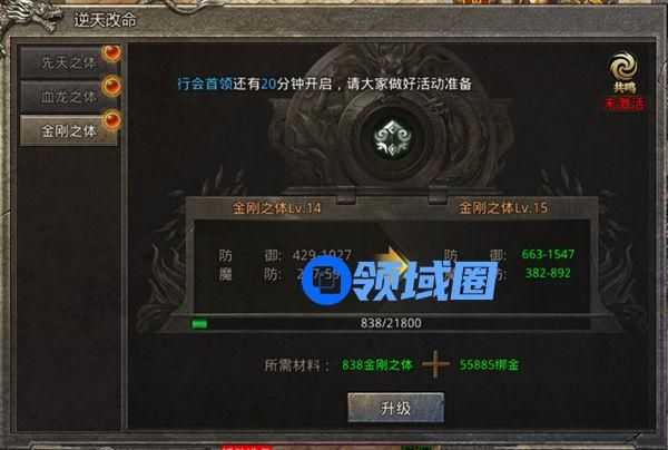 提升金刚之体需要消耗金刚之体+绑金,玩家可以在闯天关、黑市获取金刚之体,提升金刚之体等级会对应提升角色防御、魔防属性;