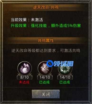 当逆天改命等级都达到10级,可激活共鸣,升级共鸣可以强化技能,额外造成5%伤害。