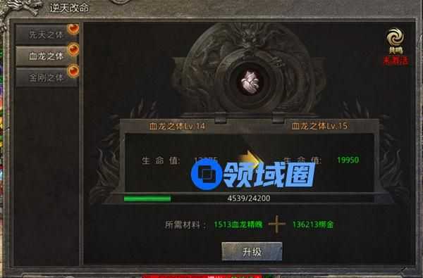 提升血龙之体需要消耗血龙精魄+绑金,玩家可以在闯天关、黑市获取血龙精魄,提升血龙之体等级会对应提升角色生命值;