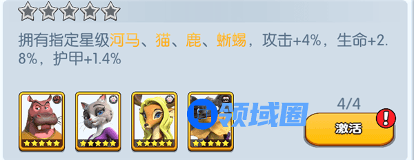 拥有指定星级河马、猫、鹿、蜥蜴,攻击+4%,生命+2.8%,护甲+1.4%