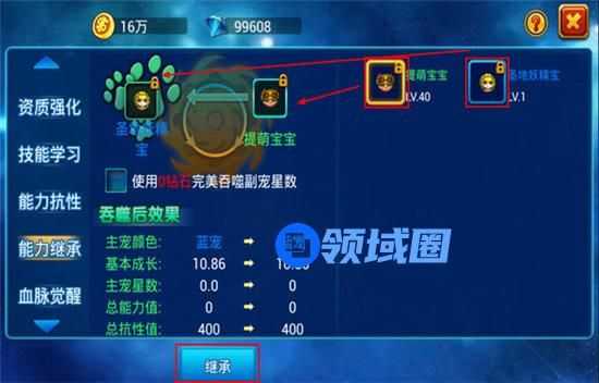 在宠物的"能力继承"中,选择想要进行能力继承的宠物,当然,是将好宝宝的能力继承给较差的宝宝,主宠为差宝宝,副宠为好宝宝。要特别注意拜访顺序呦!完成之后,点击"继承"进行继承。此时,副宠的能力就完全交接给主宠了。