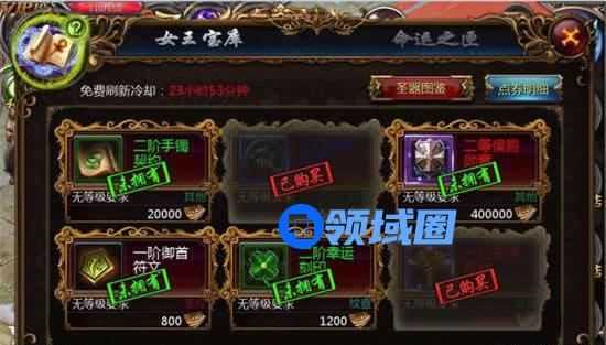 如果你不愿等待女王宝库免费推送的这段漫长时光,想要快速提升自己的实力,你也可以点击右下角的“点券刷新”或“魔石刷新”,以点券/魔石来刷出新一批圣器——当当当当!这样新一批圣器就会出现在女王宝库咯!赶快挑选吧!