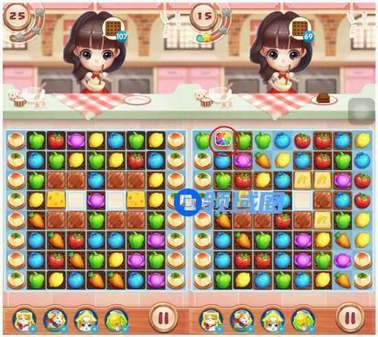 关卡越到后面,炸弹的重要性就越加凸现出来了。只有用更多的炸弹才能用越来越少的步数在越来越苛刻的地形中杀出一条血路。这一关将两边的豆腐消除掉掉落更多的食材来凑齐炸弹,这一关彩虹炸弹效果是最佳的,实在没有也不用浪费步数来强求,退而求其次用其它炸弹将地形清空出来也行。