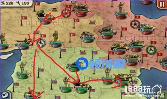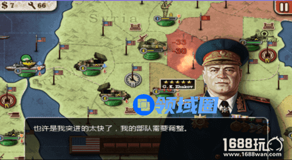 为了红色帝国的胜利,土耳其只好贡献出三级城市(bei gong xian)。随后,打掉他们的火箭炮,等待美帝来抢二级工业城。后分兵三路。左路寻找美帝火箭炮部队作战,中路轻坦+装甲车剿灭美军残部,右路配合朱可夫部队打美军在中东的重要军事基地---巴格达。朱可夫在这一战役中相当不给力,很有可能前5局内牺牲,连个跟其部主力接壤的巴格达都打不下。。。