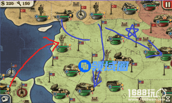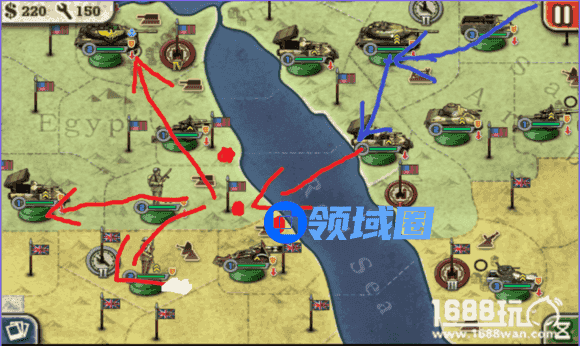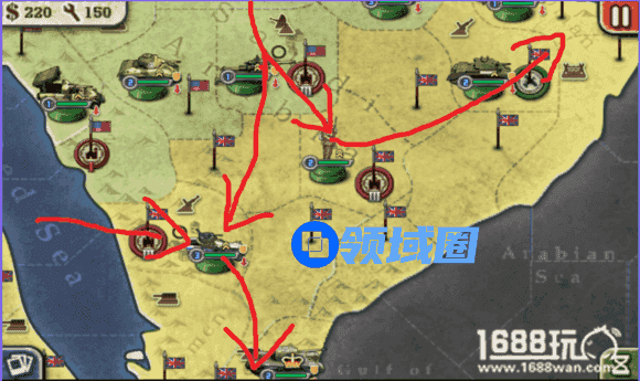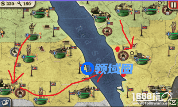 主力攻下巴格达后,我军经济必然大好,一时间关山度若飞,争渡红海,注意渡海位置。尽量选接壤多的海域渡海,这样美帝难以形成包围。选无空地登陆,只要登陆上去了,美帝的残兵败将也就不足为患。切记不可在渡海时与敌人缠斗,会处于极大劣势的。然后再次分兵三路,一路偷袭美军大本营开罗,一路消灭(至少打至半血)美军火箭炮,一路从北面及西面对英军2级工业城形成半包围。