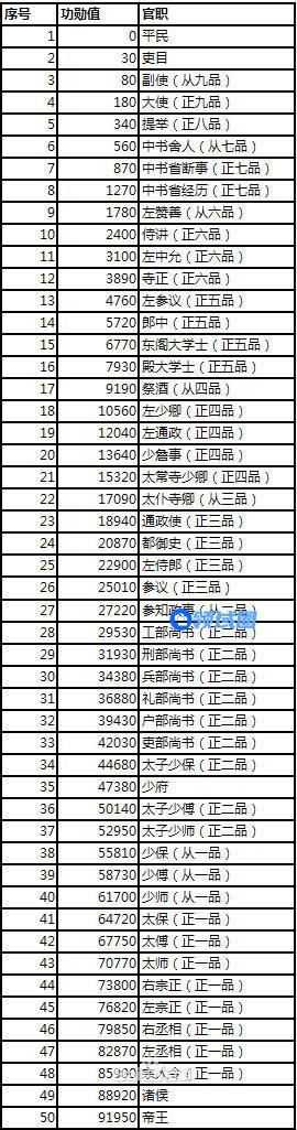 功勋对应官职如下表: