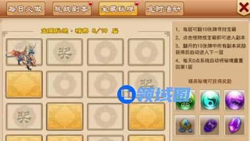 宝箱副本奖励:异宝、经验丹、铜币、强化石、紫宝石、机缘宝盒。