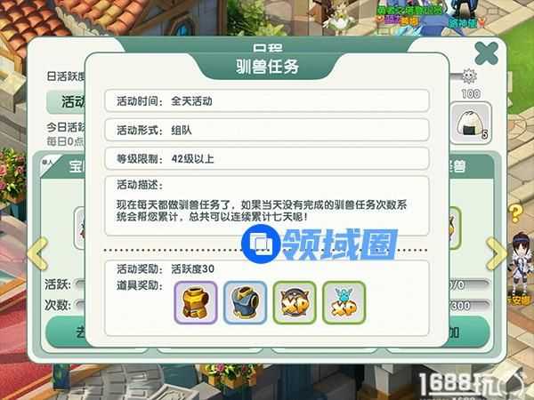 42级才能开启的任务玩法,而且当天没有完成的驯兽任务系统次数系统会累计,总计可以累计7次!驯兽任务需要三人及以上的玩家组队才能参与任务,而且每天有30环,是有点小麻烦。不过任务奖励中会掉落紫色装备、蓝色装备和海量经验!