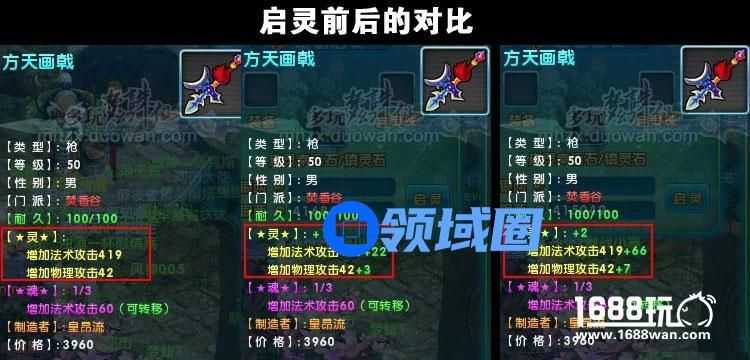 可以启灵的装备部位分别是:武器、衣服、帽子、护腕,提升的效果分别是:攻击力、防御力、魔法值上限、气血值上限。